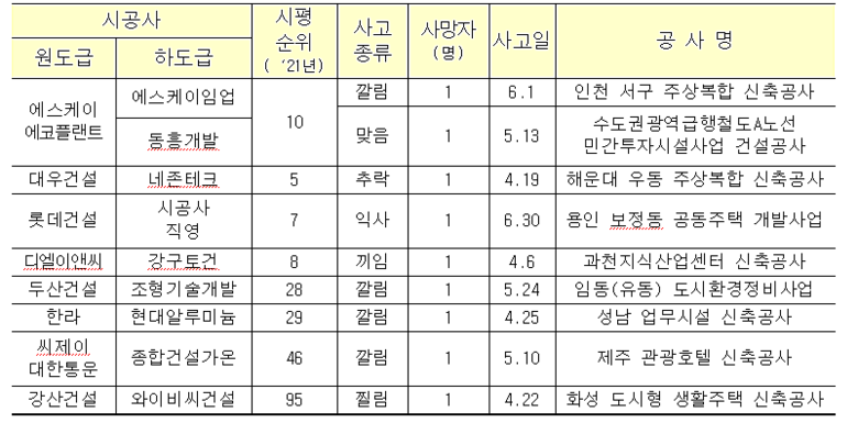 사망 사고가 발생한 공종의 하도급사는 에스케이임업, 동흥개발, 네존테크, 강구토건, 조형기술개발, 현대알루미늄, 종합건설가온, 와이비씨건설 등 8개사다.