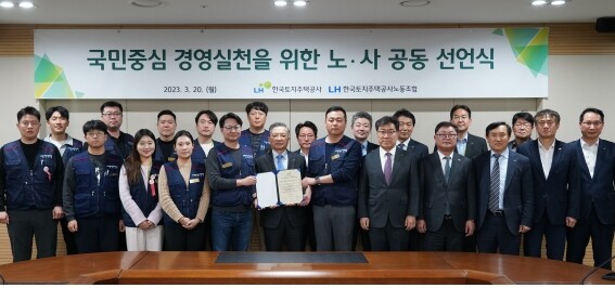 LH 노사는 이날 공동 선언문을 통해 대국민 서비스 강화와 국민 삶의 질 향상을 위한 공동 노력, 저출생·고령화 극복을 위한 선도적인 역할 수행, 직장 내 괴롭힘 근절과 세대 간 갈등 해소 등 수평적 기업문화 조성, 근로조건 개선 등을 함께 실천해나가기로 다짐했다.