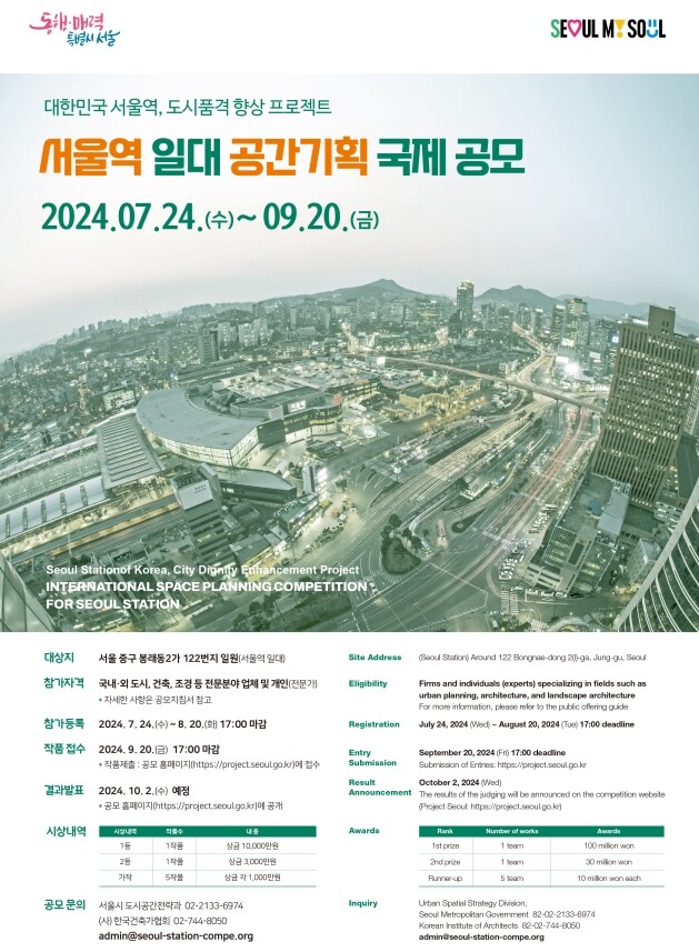 시는 전문가 심사를 거쳐 총 7개 작품을 선정할 예정이며, 당선자에게는 향후 서울시가 발주하는 '서울역 일대 공간대개조' 관련 기본 및 실시 설계 참여 시 가점이 부여될 예정이다.