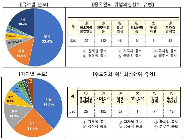 적발된 위법의심행위를 국적별로 보면 중국인이 226건(53.4%)으로 가장 많았고, 다음으로는 미국인 63건(14.9%), 필리핀인 23건(5.4%) 순이었다. 지역별로는 서울 내 위법의심행위가 161건(35.4%), 경기 102건(27.6%), 인천 63건(18.9%)으로, 수도권 위법의심행위가 전체의 77.1%를 차지했다.