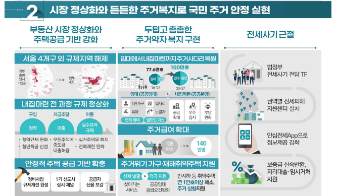 정부는 침체된 부동산 시장을 정상화 하기 위해 규제를 대폭 완화하는 계획도 내았다. 강남3구(강남, 서초, 송파)와 용산구만을 빼고 규제지역을 모두 풀고, 민간택지 분양가상한제 적용지역도 대폭 해제하는 게 핵심이다.
