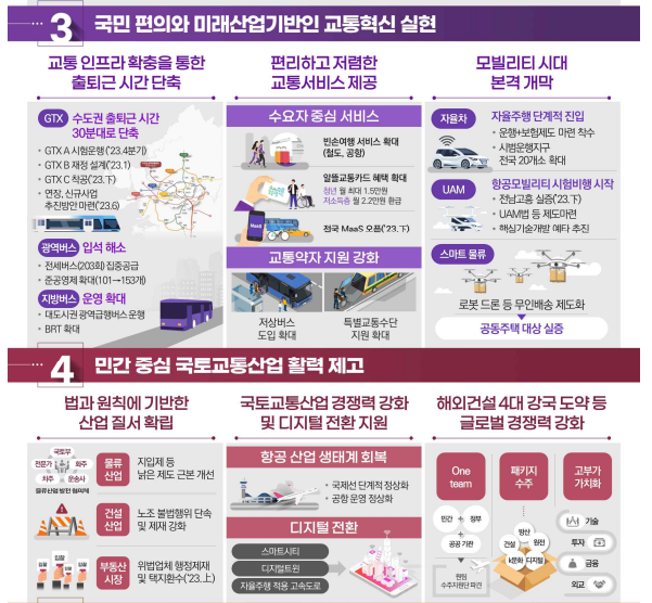 또, 국토의 입체적 개발을 위해 교통 인프라 확대를 속도감 있게 추진한다는 방침이다. 특히 경인 고속도로 지하화 착공을 위해 예비타당성조사 통과 등 사전절차를 신속히 추진하고, 이를 위해 철도역사·선로를 지하화하는 등의 내용을 담은 특별법을 올해 상반기 내 발의하고, 하반기에는 전국단위 지하화 대상 노선을 담는 종합계획 수립에도 착수한다.