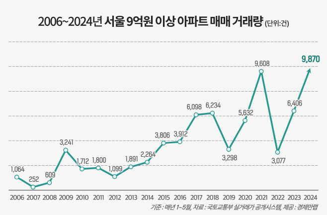 서울 9억 이상 아파트 매매 거래량은 2021년 1~5월 9608건을 기록한 뒤 2022년 3,077건으로 하락했고, 2023년 6406건으로 상승세에 오르다 올해 역대 최다로 집계됐다.