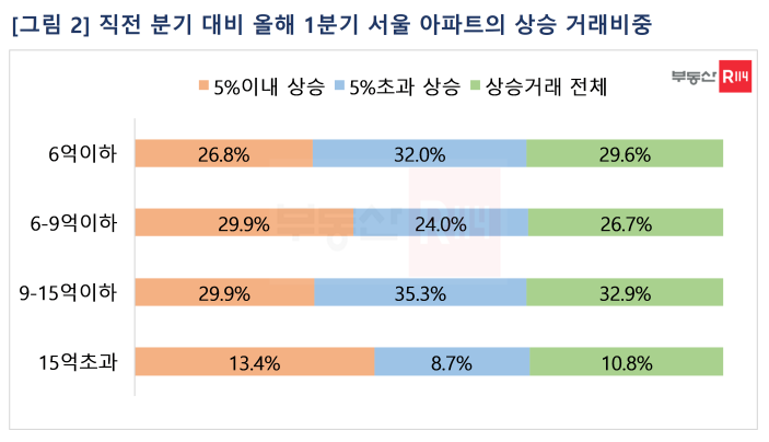 올해 들어 서울 아파트 시장에서는 직전 분기 대비 가격이 올라 거래된 비중이 과반을 넘어섰다. 대대적인 규제 완화와 봄 이사수요가 맞물리면서 가격이 크게 빠진 대단지와 소형 저가 아파트를 중심으로 급매물이 소진된 결과로 풀이된다.