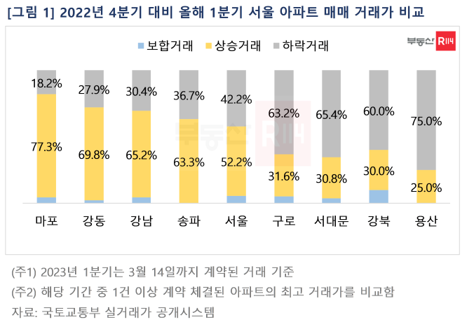 부동산R114(www.r114.com)가 국토교통부 실거래가 자료를 통해 올해 1분기(1/1~3/14)와 2022년 4분기(10/1~12/31)에 각각 동일 단지 동일 면적의 계약이 1건 이상 있었던 서울 아파트 531건의 최고 거래가격을 비교했다. 그 결과 올해 들어 직전 분기 대비 상승한 거래는 52.2%(277건), 하락 거래 42.2%(224건), 가격 변동이 없었던 거래는 5.6%(30건)로 조사됐다. 상승 거래비중은 △마포(77.3%) △강동(69.8%) △강남(65.2%) △송파(63.3%) 순으로 높았는데, 이들 지역 내 대단지에서 최근 급매물 소진 후 가격이 올라 거래된 것으로 분석됐다. 반면 용산, 강북, 서대문, 구로 등은 상승 거래비중이 낮았다.