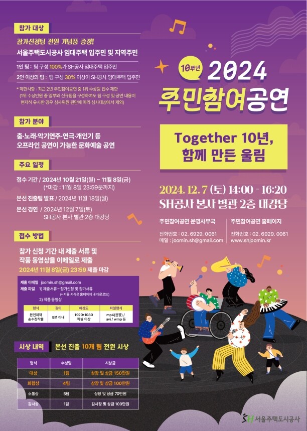 SH공사는 주민참여공연 10주년을 맞아 ‘투게더(Together) 10년, 함께 만든 울림'을 주제로, 공사와 입주민들이 함께 만들어온 10년을 기념하고 참여하는 모두에게 가슴 속 깊은 울림을 전달하는 행사로 꾸밀 예정이다.