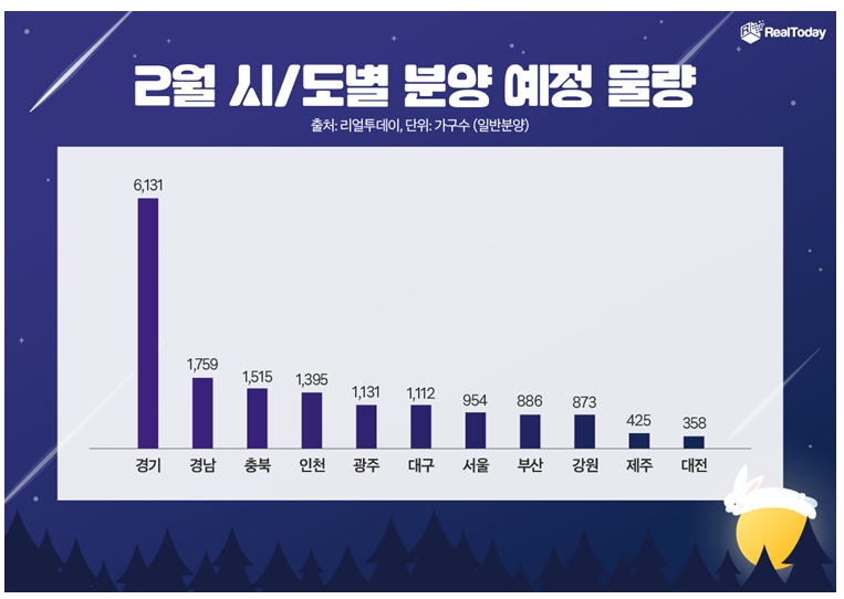 부동산 전문 리서치업체 리얼투데이에 따르면, 2월 전국에서는 24곳·2만156가구(사전청약 특별공급 포함, 임대 포함, 오피스텔 제외, 1순위 청약 기준)가 공급될 예정이다. 이 중 일반 분양 물량은 1만6,539가구다. 시·도별로는 경기가 6,131가구(9곳,37.07%)로 가장 많은 비중을 차지했으며, 이어 경남 1,759가구(2곳,10.64%), 충북 1,515가구(2곳,9.16%) 등의 순으로 물량이 집계됐다. 서울은 954가구(2곳,5.77%)다.