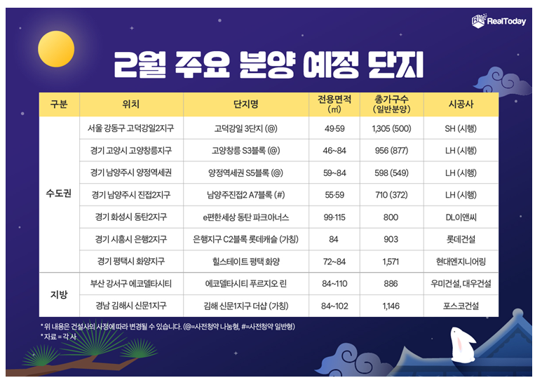 리얼투데이 관계자는 “공급 확대가 본격 시작되는 2월, 정부 주도하에 공급하는 ‘뉴홈’ 사전청약과 동탄2신도시, 수도권과 지방에서 진행하는 도시개발구역 내 신규 분양이 눈에 띈다”라며 “이들 지역은 향후 편의 및 교통, 학군 등 각종 기반시설이 체계적으로 갖춰지는 만큼 주거 편의성이 높다”라고 전했다.