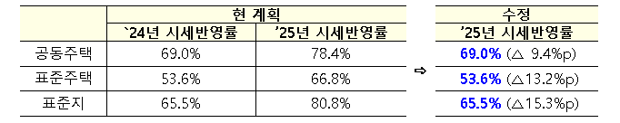 이번 공시가격 현실화 계획 수정방안은 내년 공시가격에 적용할 시세 반영률을 올해와 동일하게 현실화 계획 수립 이전인 2020년 수준으로 동결하는 내용을 담았다. 물가 상승, 가계부채 증가 등 국민적 부담이 큰 상황에서 기존 현실화 계획이 규정하고 있는 약 10~15%p 정도 높은 시세반영률이 그대로 적용될 경우 국민들의 경제적 부담이 가중될 수 있어서다.
