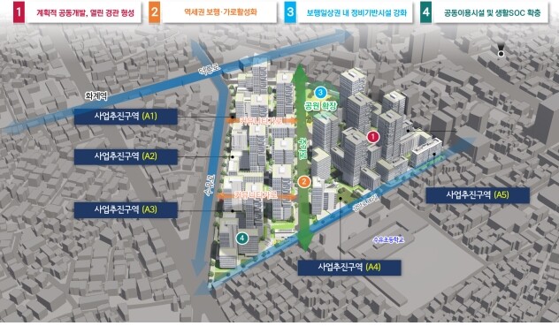 아울러, 사업에 반대하는 간선도로변 상가지역은 사업가능구역에서 제척해 토지등소유자들이 필요 시 개별신축이 가능하도록 건축협정, 자율주택정비 방식 등을 자유롭게 선택해 추진할 수 있도록 했다.