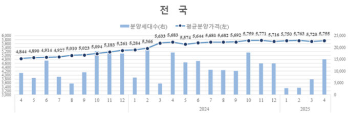 전국 아파트 기준 ㎡당 분양가는 575만5000원으로 전월(572만원)보다 0.6% 올랐다. 전년 동월(568만3000원)에 비해선 1.2% 상승했다.