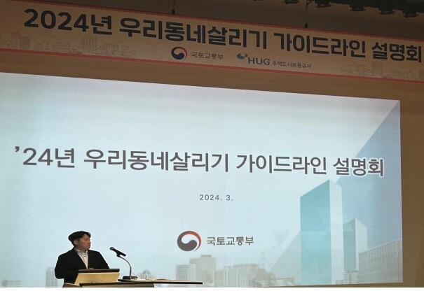 HUG는 국토교통부와 함께 우리동네살리기 신규사업 선정을 위해 지난 20일 정부세종청사에서 전국 지자체 공무원을 대상으로 '우리동네살리기 가이드라인 설명회'하고 선정규모ㆍ방식ㆍ절차ㆍ주요일정 등을 안내한 바 있다.