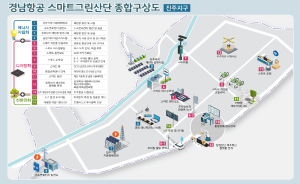 구체적으로 입주기업 지붕, 유휴부지 등에 태양광 발전(27MW) 및 수소연료전지 발전소(5MW) 설치 등을 통해 에너지를 절감하고, 산업단지 내 스마트 횡단보도, 스마트 주차장, 스마트폴 등 스마트 교통・안전 인프라를 구축해 효율성과 안전성을 제고하는 한편, 입주기업의 생산성 향상 지원을 위한 제조혁신플랫폼, 우주항공시험시설 등 다양한 사업을 연계한다.