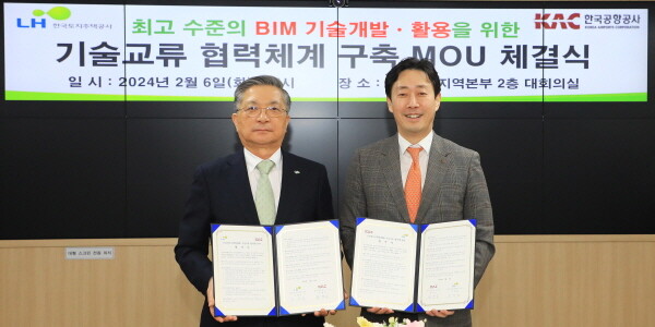 한국토지주택공사(LH)는 한국공항공사(KAC)와 건설정보리모델링(BIM) 기술 협력체계 구축을 위한 업무협약을 체결했다고 7일 밝혔다.