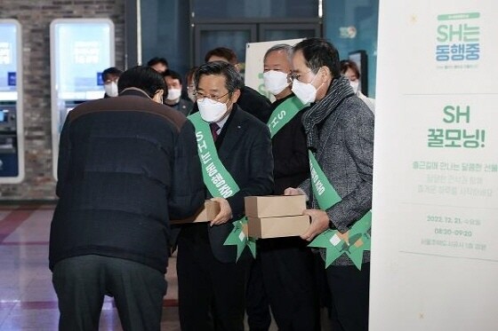SH공사는 특히 동료의 행복을 존중한다는 의미에서 'SH는 동행중'이라는 슬로건을 선언하고, 실천의지를 다졌다. 이를 기념해 21일 강남구 본사에서는 출근맞이 행사를 열고 'SH는 동행중' 간식박스도 나눴다.