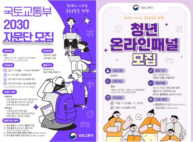 [한국건설경제뉴스=이보미 기자] 국토교통부는 국토교통 주요 정책에 청년 세대의 시각을 반영하기 위해 오는 22일부터 31일까지 제3기 '2030 자문단(대면창구)'과 '청년온라인패널(비대면 창구)'를 모집한다고 밝혔다.