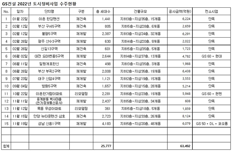 GS건설은 지난 1월 서울 용산구 이촌동에 위치한 이촌한강맨션 재건축사업 시공사 선정을 시작으로 최근 성남 신흥1구역 재개발정비사업까지 모두15건의 도시정비사업을 수주하며, 총 6조3,492억의 수주액을 기록했다고 23일 밝혔다.