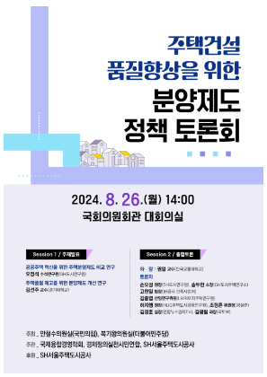 [한국건설경제뉴스=이보미 기자] 서울주택도시공사(SH공사)는 안철수·복기왕 국회의원, 국제융합경영학회, 경제정의실천시민연합과 함께 오는 26일 오후 국회의원회관 대회의실에서 주택품질 제고를 위해 국내 분양제도가 나아갈 방향을 모색하는 정책 토론회를 연다고 20일 밝혔다.