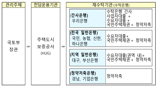 전국 및 지역 일반수탁은행은 수요자 대출*(구입·전월세자금 대출), 국민주택채권, 청약저축 업무를, 청약저축 수탁은행은 청약저축 관련 업무를 수행한다. 지역 일반수탁은행은 해당 권역(대구=대구·경북, 부산=부산·울산·경남) 내 수요자 대출 취급한다.