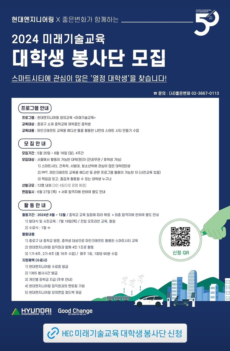 현대엔지니어링이 ‘2024 미래기술교육 대학생 봉사단’을 모집한다고 5일 밝혔다.