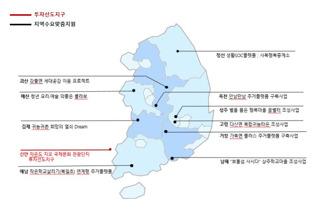 정부가 전라남도 신안군에 있는 자은도를 투자선도지구로 선정했다. 경상남도 거창군과 충청북도 괴산군, 경상남도 남해군 등 10곳은 학교 살리기, 청년 창업 지원 등 지역 유입인구 수요를 반영한 지역맞춤형 생활 거점 조성 사업이 추진된다.
