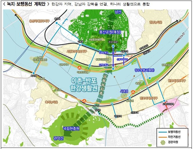 향후 잠수교가 보행교로 전환되면 한강과 지역, 강북과 강남을 연결하는 녹지·보행체계가 완성되며, 이촌생활권과 반포지구가 하나의 생활권으로 연결될 전망이다.