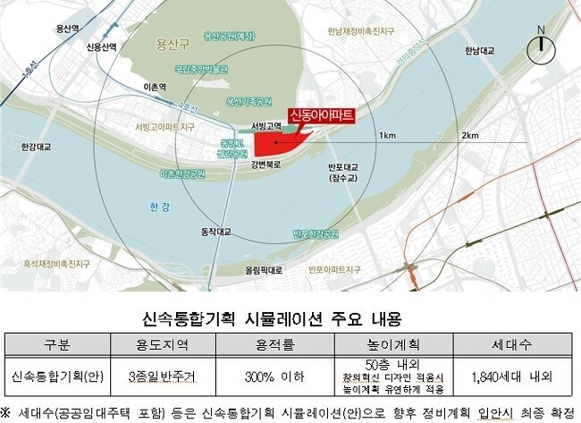 | ▲서빙고 신동아 아파트 위치도(위)와 신속통합기획 시뮬레이션 주요 내용 / 제공=서울시 |
