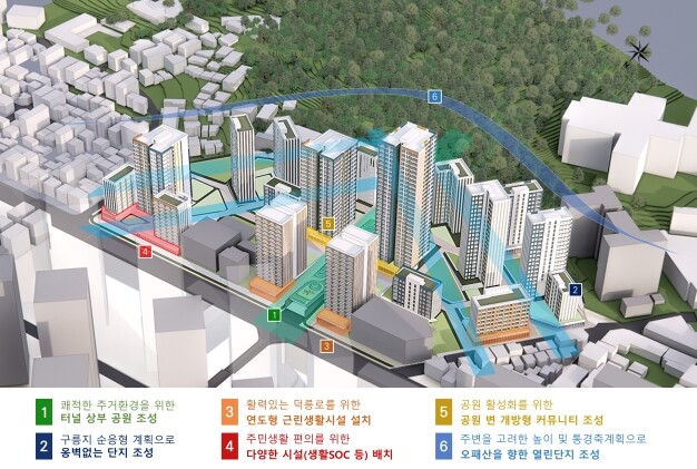 이 일대는 반지하 등 노후주택 비율이 높고, 오패산 자락의 급경사지로 눈.비로 인한 안전사고 위험 등 주거환경이 열악한 곳이다. 시는 이에 경사를 활용한 단지내 입체공원 계획 및 보행환경 정비 등 자연을 품은 쾌적하고 안전한 주거단지 조성에 주안점을 뒀다.