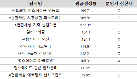 | ▲올해 분양 단지 중 경쟁률 상위 10개 단지 <자료제공=부동산R114> |