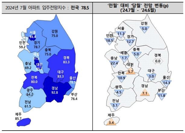 7월 전국 아파트 입주전망지수는 78.5으로 6.5p(2024년 6월 85.0→7월 78.5) 하락할 것으로 조사됐다. 지역별로 수도권은 14.2p(91.6→77.4), 광역시는 4.9p(84.9→80.0), 도지역은 4.7p(82.5→77.8) 하락할 것으로 조사됐다.