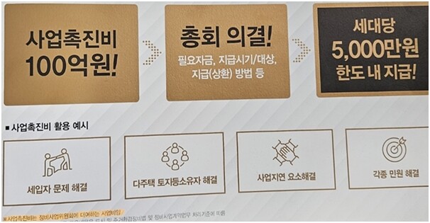 | ▲퇴계원2구역 정비사업위원회에 제출한 두산건설 사업제안서. 사업촉진비 100억원, 세대 당 5000만원씩 지급하겠다 제안해 위법논란이 발생했다. 제안서 하단에 '사업촉진비는 정비사업위원회에 대여하는 사업비'라고 기재했는데 정비사업위원회는 법적 요건이 없는 임의 단체로, 사업비 수령이 사실상 불가능하다. 사진=주민 제공 |