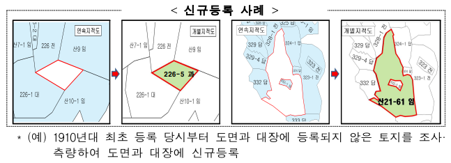 그 결과 여의도 면적(2.9㎢)의 2배에 해당하는 미등록 토지가 나와 국유재산으로 등록했다. 또, 도면과 대장에 등록돼 있으나, 경계나 면적에 오류가 있는 1만512필지(지적공부 등록면적 0.7㎢ 증가) 경우는 정정해 명확히 했다. 국토부는 앞으로 신규 등록 토지의 권리관계를 확인해 소유관계를 명확히 할 계획이다.