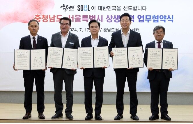 ▲김헌동 SH공사 사장(오른쪽부터)과 오세훈 서울시장, 김태흠 충남도지사, 김동일 보령시장, 김병근 충남개발공사 사장이 골드시티 추진을 위한 업무협약을 체결하고 기념촬영하는 모습. 사진=SH공사 제공