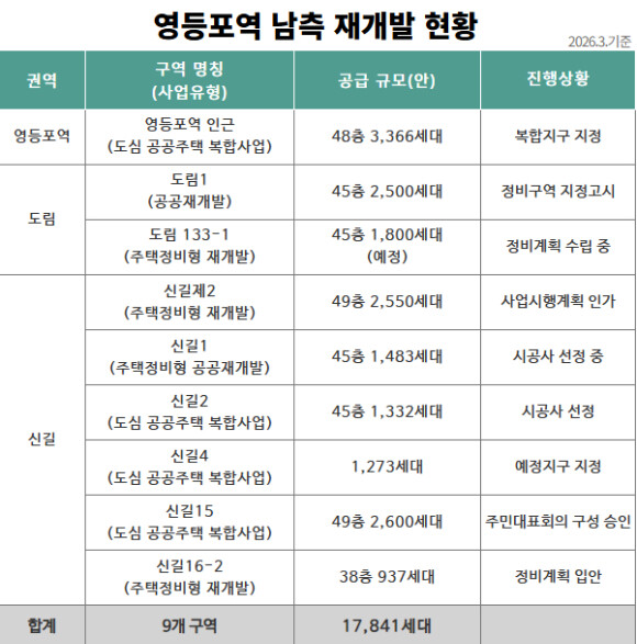 도림동과 신길동 일대에도 고층화 사업이 속도를 내고 있다. 도림1구역(2500세대)과 도림 133-1구역(1800세대)은 각각 최고 45층 높이의 단지로 정비될 계획이다. 특히 신길제2구역(2550세대)과 신길15구역(2600세대)은 최고 49층 규모의 초고층 단지로 변모하며 지역 스카이라인을 재편할 전망이다.