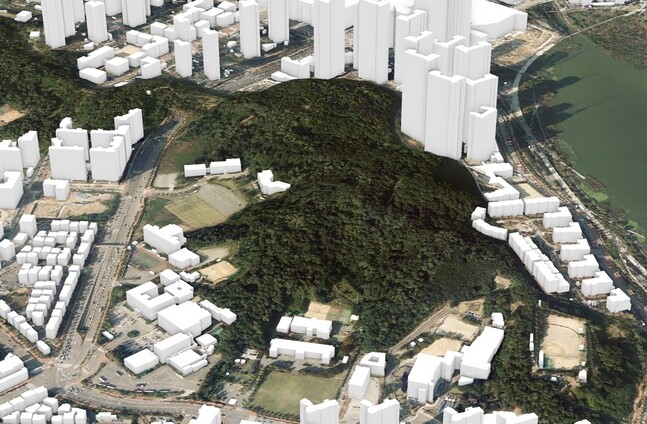 | ▲ 3차원 건물 모형을 이용한 수원시 국토지리정보원 주변 지역 모델링 예시. 사진=국토부 제공 |