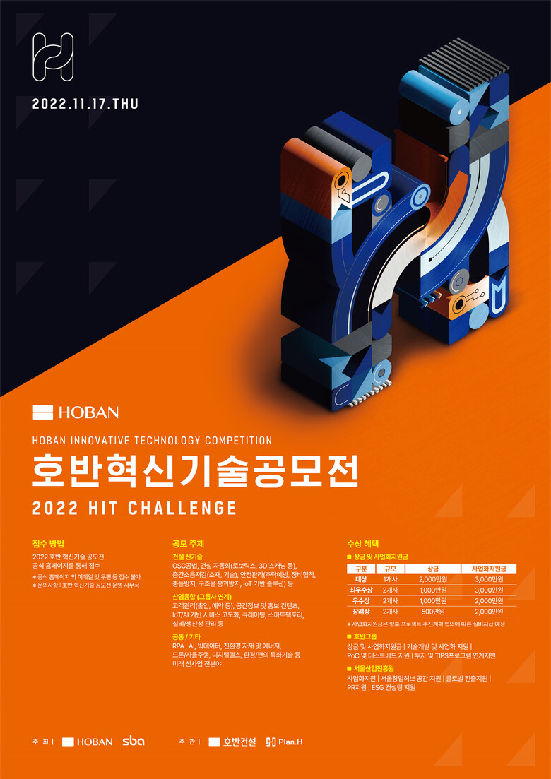 이번 공모전의 모집 분야는 미래 신기술 전 분야에 해당한다. 세부 주제는 ▲건설 신기술(OSC공법, 건설 자동화, 충간소음 저감(소재, 기술), 안전관리(추락 예방, 장비협착, 충돌 방지, 구조물 붕괴 방지, IoT 기반 솔루션 등)) ▲산업융합(호반그룹 내 다양한 계열사의 사업 및 본사 운영과 관련된 고객관리, 공간정보 및 홍보 콘텐츠, IoT/AI 기반 서비스, 큐레이팅, 스마트팩토리, 설비/생산성 관리 등) ▲공통 및 기타(RPA, AI, 빅데이터, 친환경 자재 및 에너지, 드론/자율주행, 디지털 헬스, 환경/편의 특화기술 등)이다. 공모전 참가는 10월 28일까지이고, 2022 호반혁신기술공모전 공식 홈페이지에서 신청하면 된다.