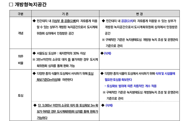 먼저, 개방형녹지 개념 재정립 및 기준 변경을 통한 실효성 있는 녹지공간 조성을 유도했다. 입체 녹지공간도 개방형녹지로 인정해 유연한 건축계획 및 다양한 녹지공간 조성을 유도하도록 했다. 입체 녹지공간은 토심(土深) 1m 이상으로 조성하고 별도의 접근 가능한 동선이 전제되어야 한다. 개방형녹지의 토심 3m 기준은 유연하게 변경하여 합리적인 건축계획을 유도했다.