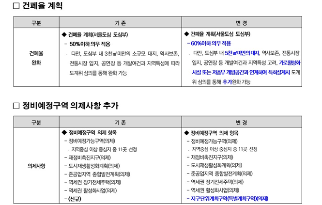 저층부 개방공간 유도, 가로활성화 용도 도입 등을 위해 건폐율을 완화했다. 개방형녹지 의무비율 삭제에 따라 저층부 개방공간 유도 등 합리적 계획이 가능하도록 기존 50% 이하 기준을 60% 이하로 완화했다.