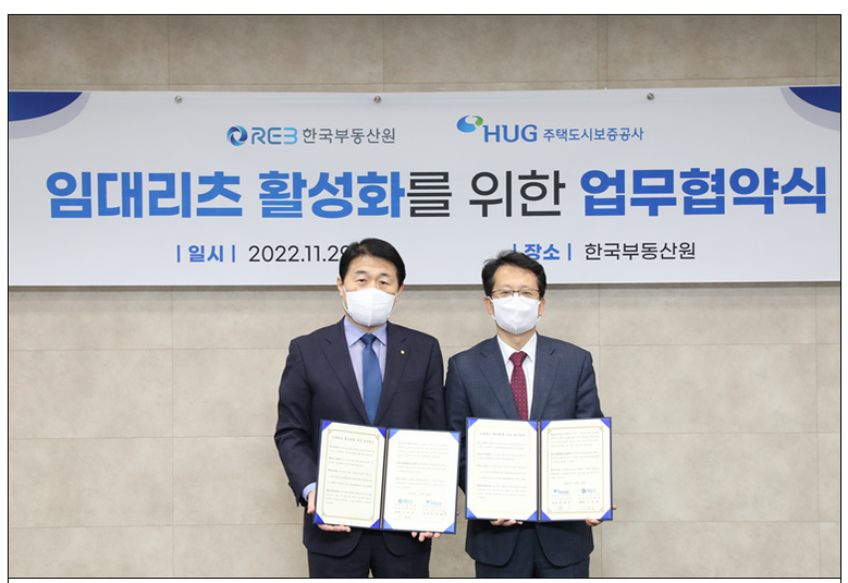 한국부동산원은 29일 한국부동산원 본사에서 주택도시보증공사(사장직무대행 이병훈, 이하 HUG)와 임대리츠 활성화를 위한 업무협약(MOU)을 체결했다고 밝혔다.