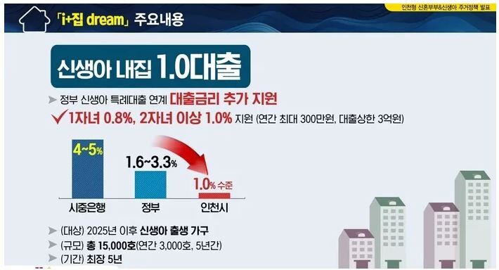 자녀를 출산한 가구의 내 집 마련을 돕기 위한 ‘신생아 내 집 마련 대출이자 지원(1.0대출)’도 추진한다. 이 사업은 정부가 지원하는 신생아특례디딤돌대출(최대금리 3.3%, 최저금리 1.6%) 등 이미 인하된 금리에 인천시가 추가로 이자를 지원한다.