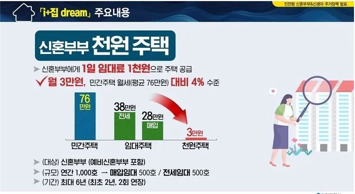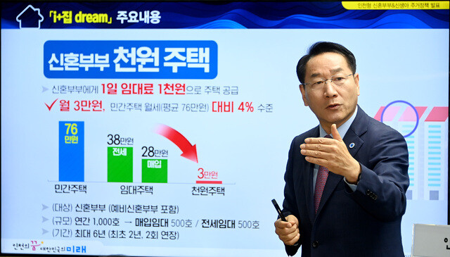 [한국건설경제뉴스=최대식 기자] 인천시가 신혼(예비)부부들에게 하루 임대료가 1000원인 ‘천원주택’과 주택담보대출 이자 1%를 추가 지원하는 ‘1.0대출’인 인천형 주거정책을 내놨다. 저출생 문제의 큰 원인 중 하나인 ‘집값’ 부담을 줄이기 위해서다.