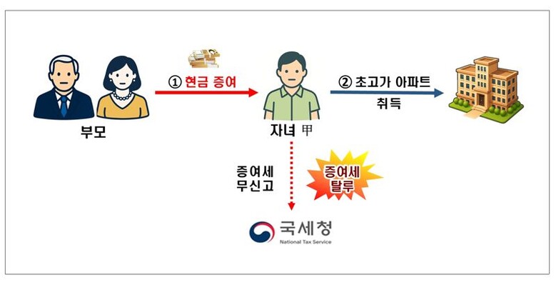| ▲대출은 최대로, 부족한 자금은 부모로부터 증여받아 초고가 아파트를 취득하면서 증여세 탈루. 국세청 제공 |