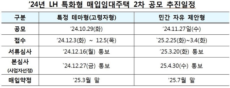 | ▲2024년 LH 특화형 매입임대주택 2차 공모 추진 일정 / 제공=LH |