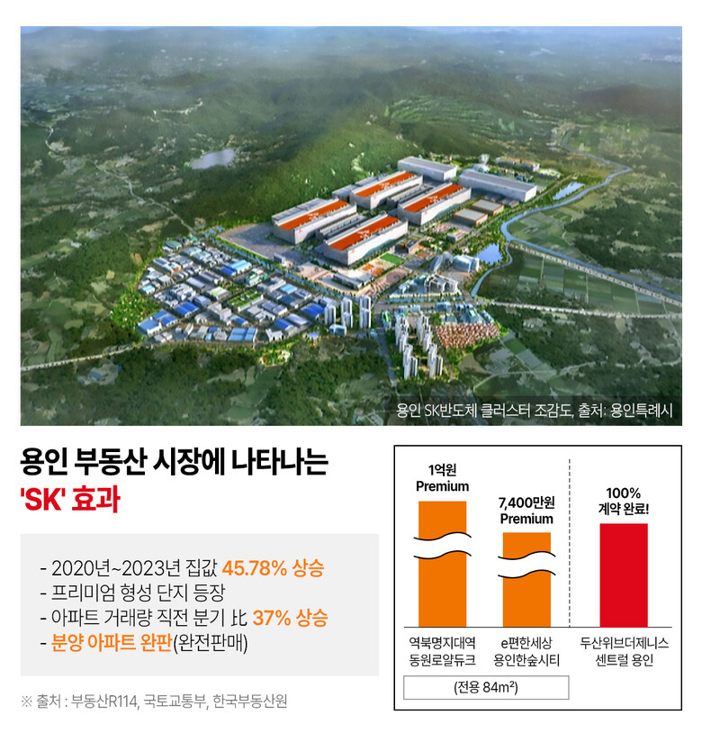 이는 SK하이닉스 효과를 톡톡히 누리고 있기 때문으로 분석된다. 처인구 원삼면에는 SK하이닉스가 122조 원을 투자해 ‘용인 반도체 클러스터’를 조성하고 있다. 415만㎡ 면적에 반도체 생산시설(팹)을 짓고 차세대 메모리를 생산할 계획이다. 삼성도 수백조원의 투자를 예고한 상태지만, 단기적으로는 사업이 더 가시권에 들어온 SK하이닉스 효과가 투자자들을 끌어들이는 것으로 해석된다.