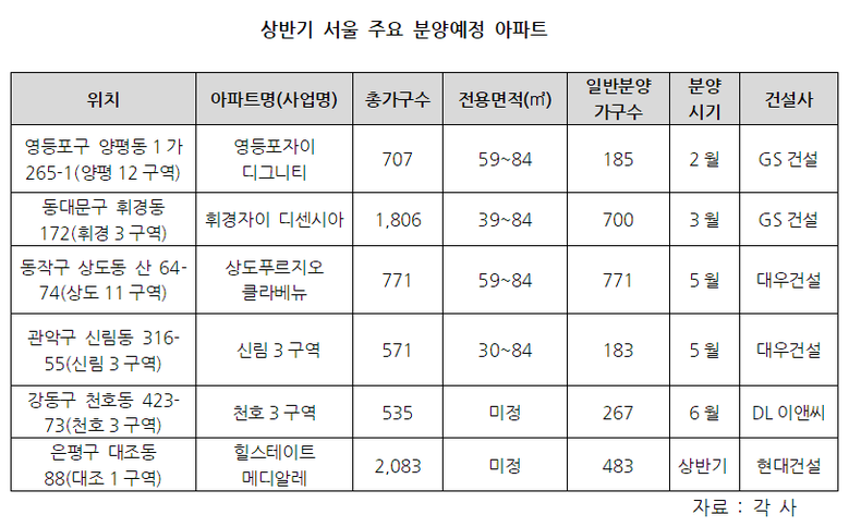 올 상반기 서울에서 7,600여 가구의 아파트가 분양될 예정이다. 지난 1월 정부의 1.3 부동산 대책으로 강남3구와 용산구를 제외한 서울 전 지역에 대한 규제가 풀리면서 그간 미뤄왔던 서울 신규 공급이 활발해질 전망이다.