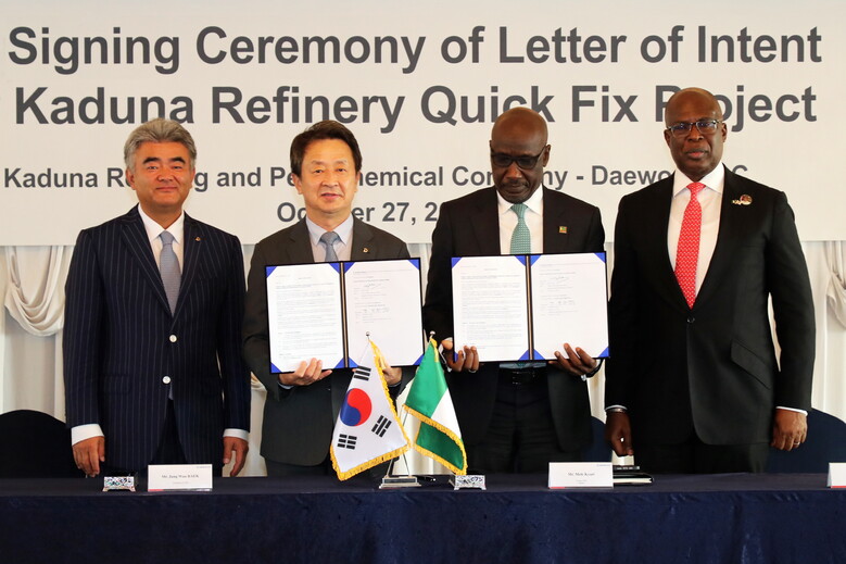 | ▲27일 백정완 대우건설 사장(가운데 왼쪽)과 멜레 키야리(Mele Kyari) NNPC사 Group CEO(가운데 오른쪽) 소공동 롯데호텔서울에서 카두나 정유시설 긴급보수공사 LOI를 접수하고 기념촬영하고 있다. 사진왼쪽부터 정원주 부회장, 백정완 대우건설 사장, 멜레 키야리 NNPC사 Group CEO, 티미프레 실바 석유자원부 장관<사진제공=대우건설> |