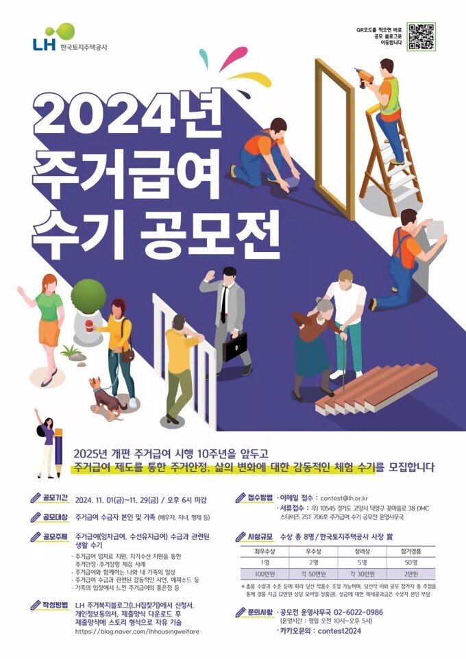 [한국건설경제뉴스=이보미 기자] 한국토지주택공사(LH)는 1일부터 주거급여 수급자를 대상으로 '2024 주거급여 수기 공모전'을 연다고 밝혔다.