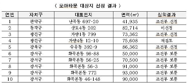 주민갈등 및 사업실현성 여부, 지역여건 등을 고려하여 동작구 상도4동은 미선정하였고, 광진구 자양4동은 재검토, 강서구 화곡본동 5개소는 조건부 보류했다.