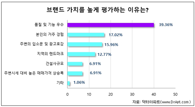 응답자들이 선택한 브랜드 가치를 높게 평가하는 이유로는 품질 및 기능이 우수하기 때문(39.36%)이라는 답변이 가장 많았다. 본인의 거주 경험(17.02%), 주변의 입소문 및 광고호감(15.96%) 등이 뒤를 이었다.