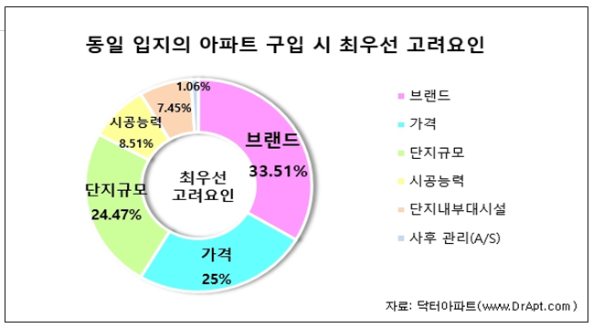 한편 동일한 입지에서 아파트 구입시 최우선적으로 고려하는 요인으로는 브랜드가 33.51%로 지난해에 이어 1위를 차지했다. 뒤를 이어 가격(25%), 단지규모(24.47%), 시공능력(8.51%) 등을 꼽았다.